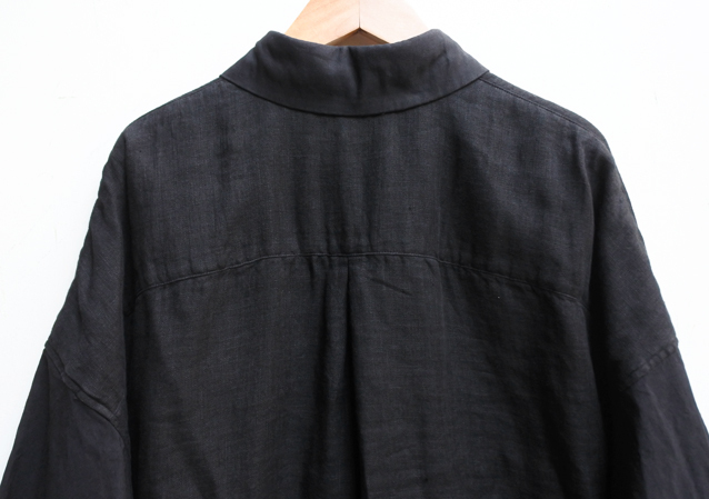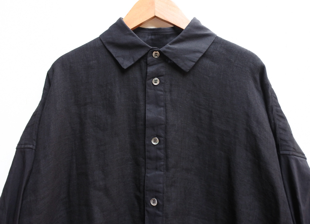 袖、襟元、ボタンの前あき部分は綿麻の布帛素材で切り替えています。