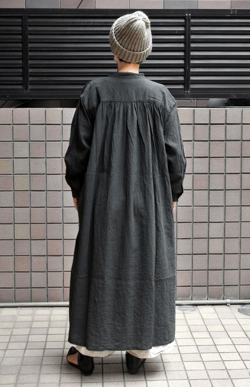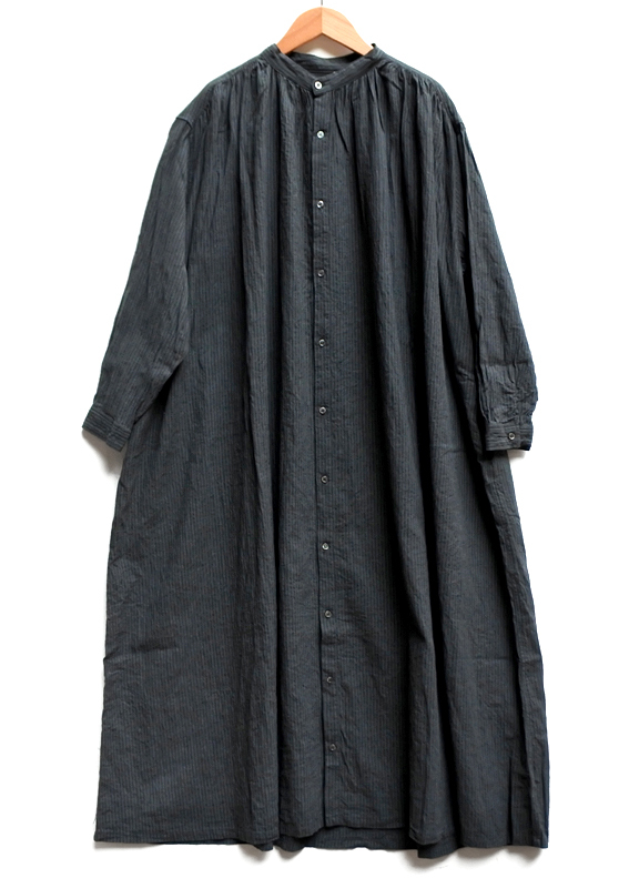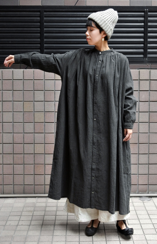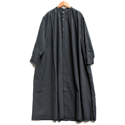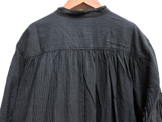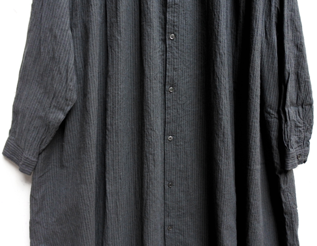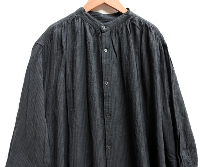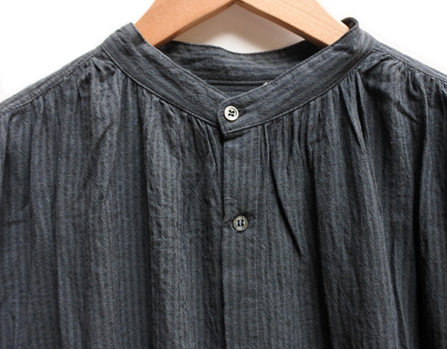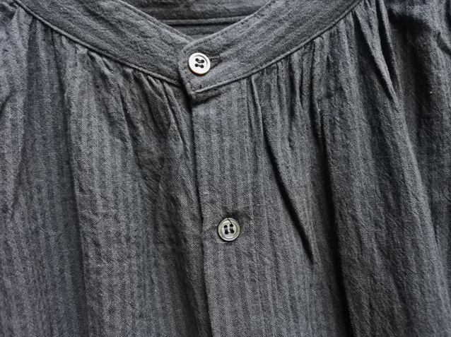 首元は襟の無いすっきりとした印象のバンドカラー。