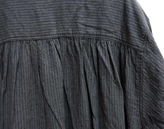 肩や背面のヨーク下から細かなギャザーをたっぷりと寄せて贅沢な雰囲気に。
